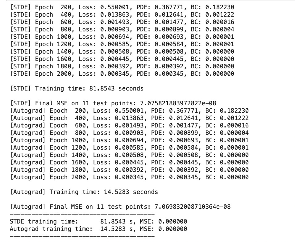 Apparently using STDE has only increase the training time for our PINN. Although we get the same results as traditional autograd method, but due to the computational overhead posed by Pytorch, we aren’t able to sped up the training.