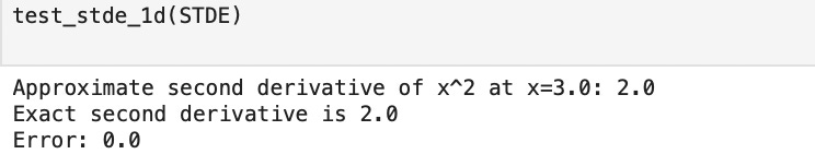return operator_valueThat’s a very looooong code. But with this, we have managed to implement the STDE in pytorch. But, we need to first test this, whether it’s working or not. We have to test on two fronts. Since we’re only estimating the derivative using taylor expansion, and we only randomly selected which derivatives to use (based on probabilities), then by using STDE, we might not get an accurate results compare to traditional methods. So, let’s test that part first.