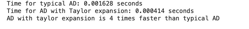 print(f"AD with taylor expansion is {time_typical/time_taylor:.0f} times faster than typical AD")Which shows the results: